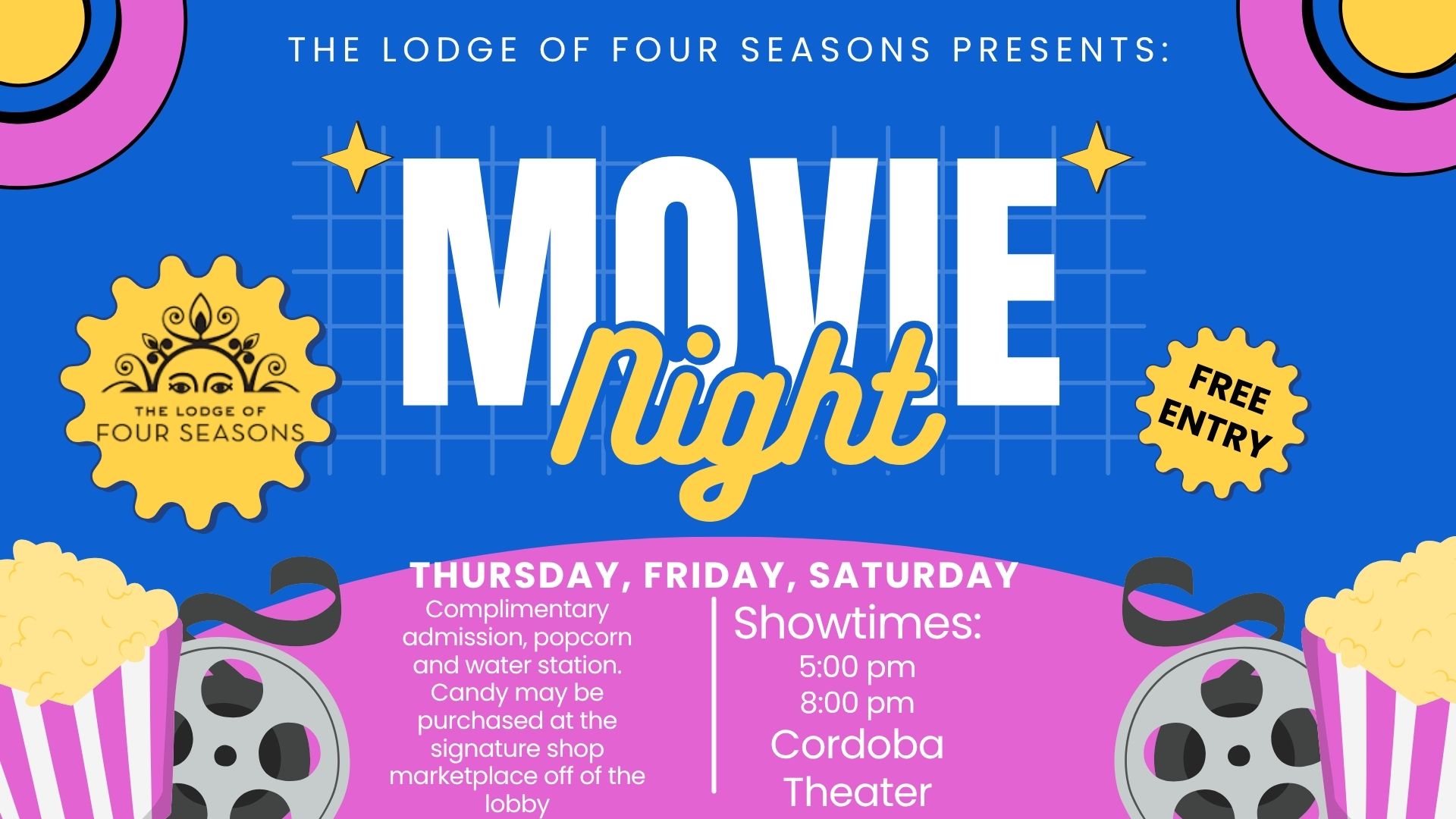 Please visit the front desk at The Lodge for the weekly movie listings.