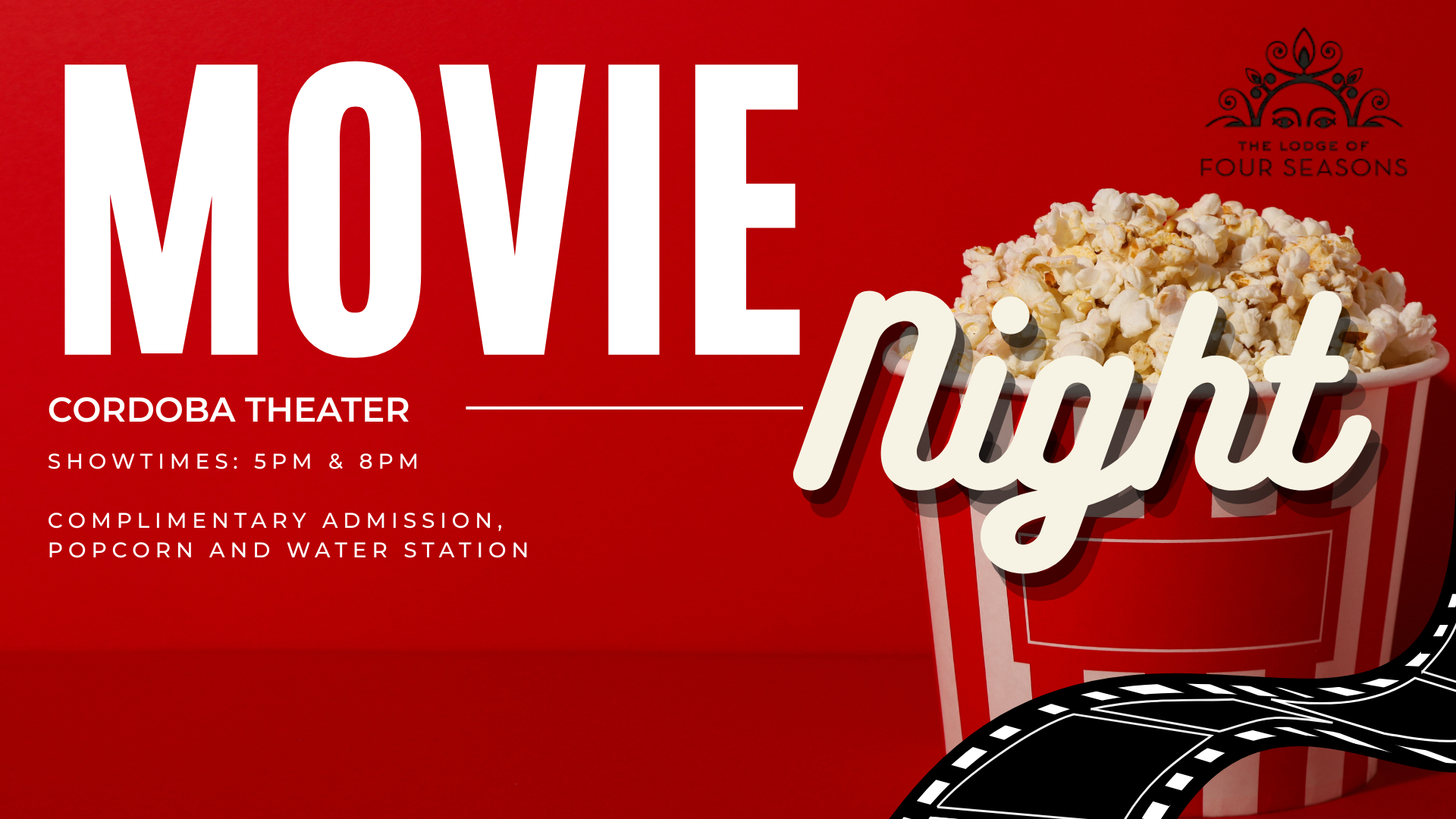 You’re invited to join us for Movie Night at our newly-remodeled Cordoba Theater. Showtimes are at 5:00 pm and 8:00 pm on Thursday, Friday and Saturday. Complimentary admission, popcorn and water station included. You may purchase candy at our Signature Shop off of the lobby.
