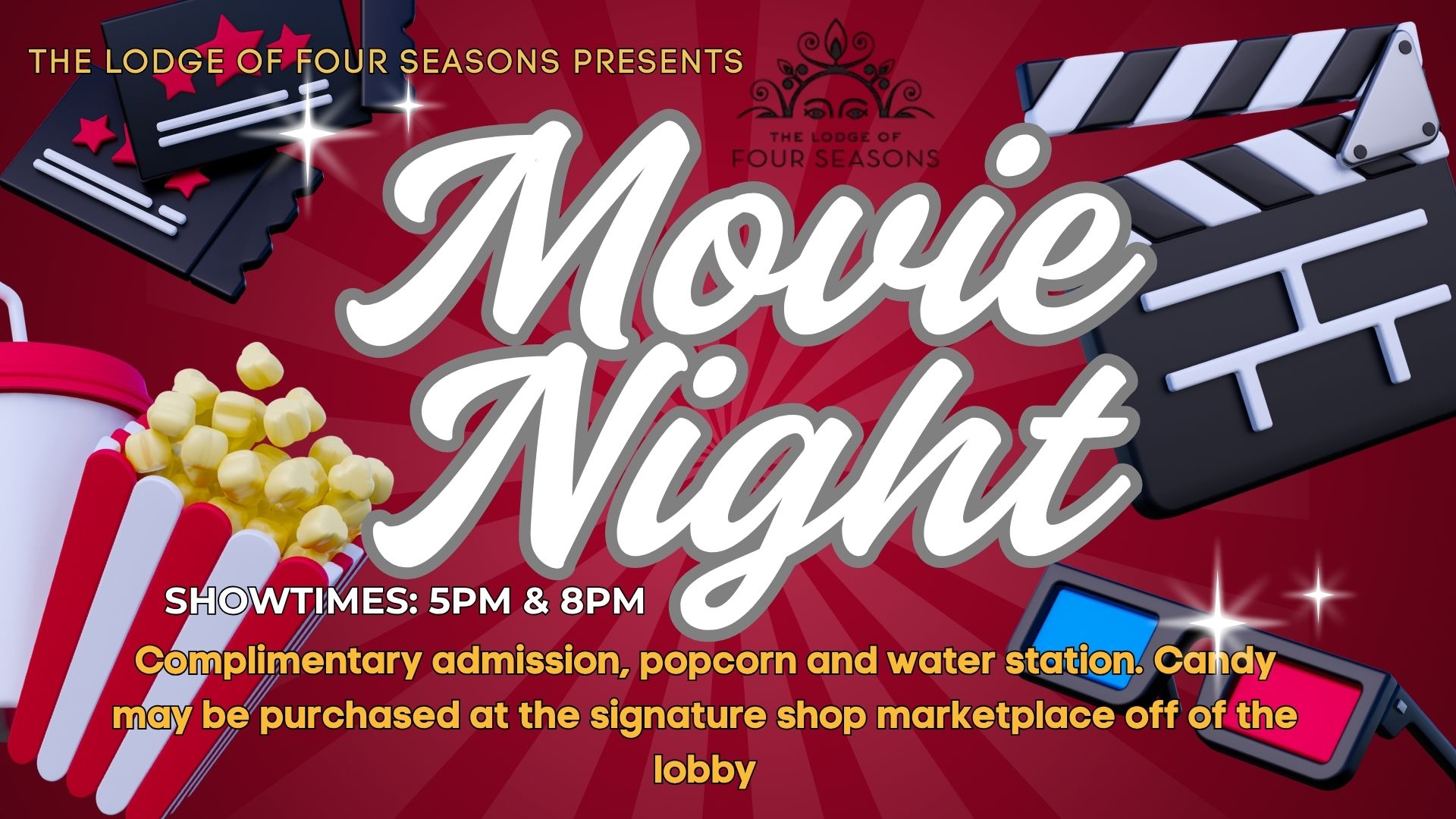 Please visit the front desk at The Lodge for the weekly movie listings.