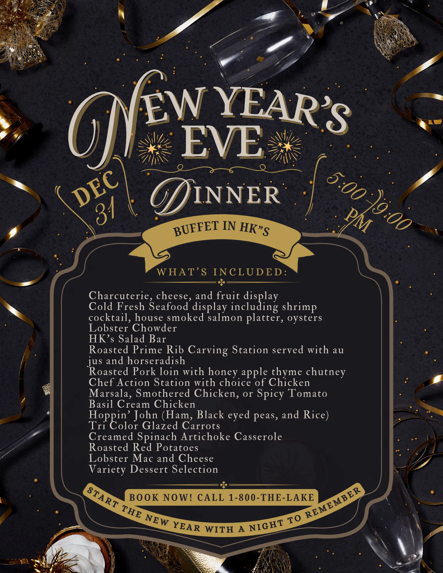 - Delicious dinner buffet at HK’s (5–9 p.m.) with live music (6:30–9:30 p.m.).