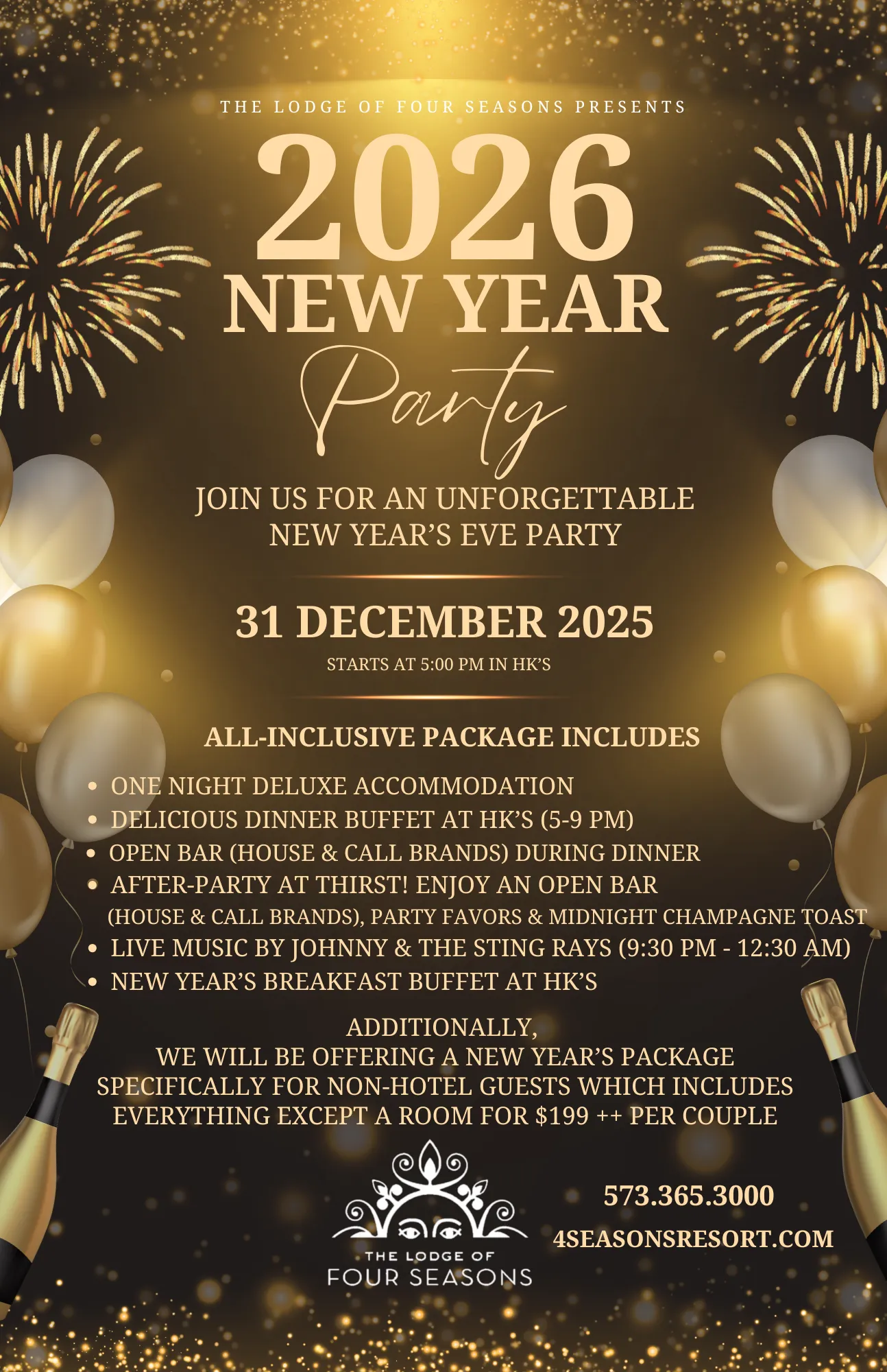 - We will be offering a New Year’s Package for non-hotel guests to enjoy New Year’s Eve at The Lodge, without having to book a room. This package includes everything above, except the room for $199++ per couple and breakfast. Please call 573-365-3000 for full details!