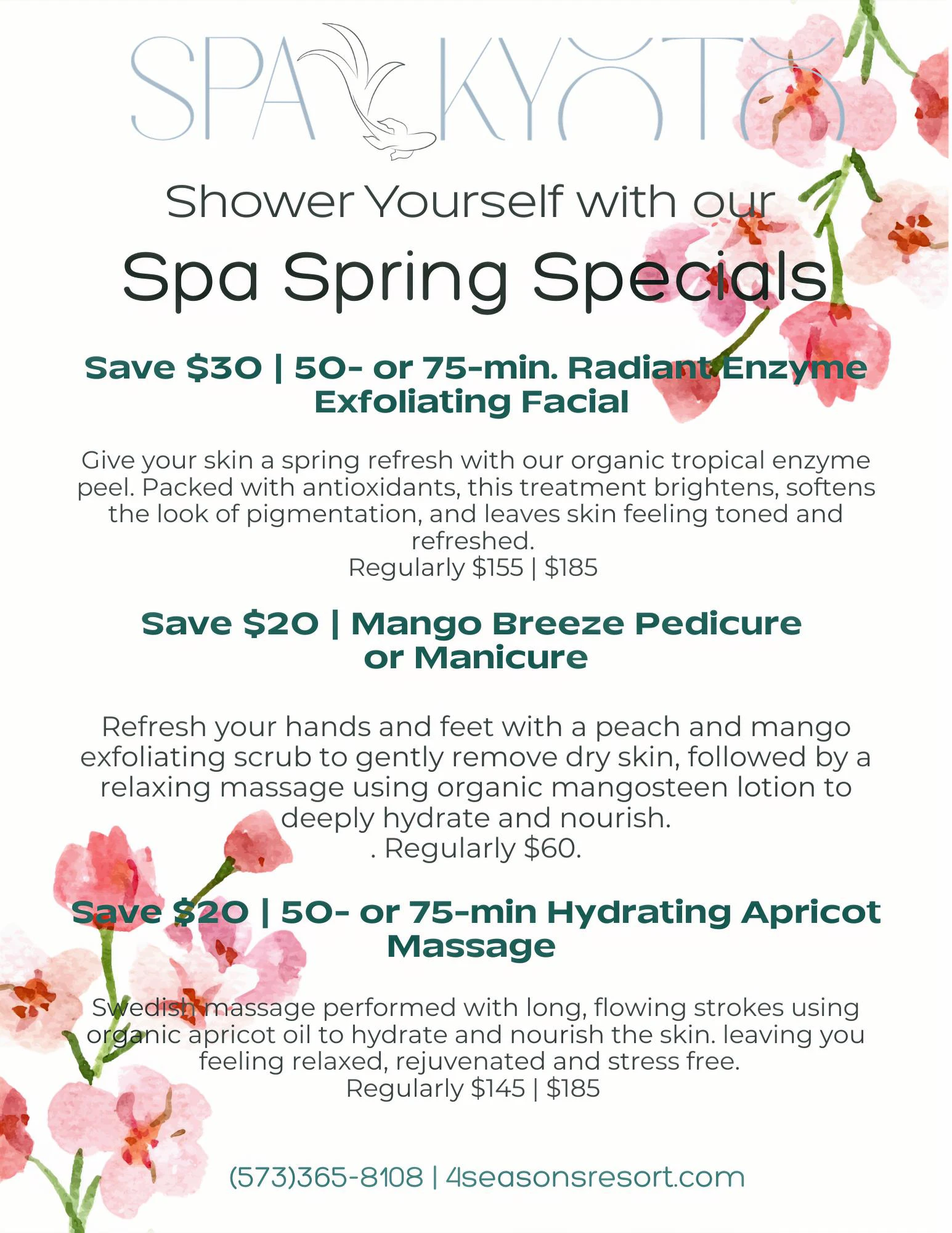 Our special treatments are often seasonal, inviting you to experience everything from pumpkin-themed treatments in the fall, to peppermint in the winter. Watch for our special offers for the perfect excuse to pamper yourself or give the gift of pampering to someone special. From its eucalyptus-infused steam rooms and infrared Himalayan salt stone saunas to its salt-purified whirlpool, we deliver a calming, luxurious atmosphere where guests can unwind, relax and enjoy a world-class spa experience. With a special, there’s even more reason to experience Spa Kyoto for yourself!